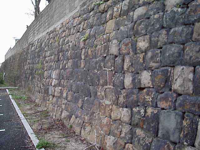 敷地北東側に残る石垣も集治監時代に積まれたものである。これには地元で産出される通称「七浦石」(砂岩)が使用された。 | ![]() |