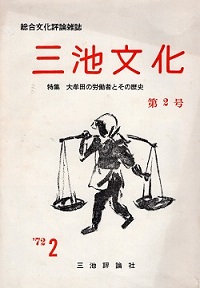 1972年2月25日三池評論社発行。特集 大牟田の労働者とその歴史。「元三池労組組合長宮川睦男」「プロレタリア詩人内田博」「元三池炭鉱労働者若松沢清」等の投稿有り。巻頭言に「労働と貧困の街大牟田といったらいい過ぎであろうか。労働は常に貧困との闘いなしにはあり得なかった」と記されてある。