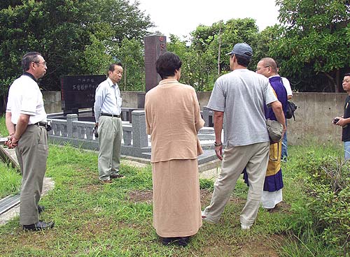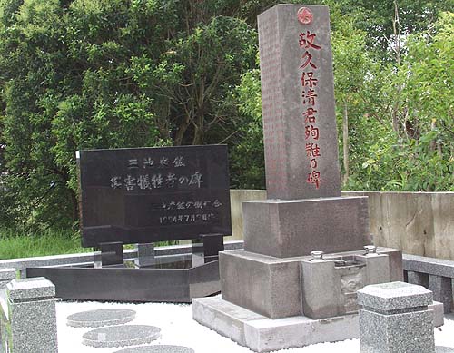 2005年7月29日、私たちは同寺院住職にその時のいきさつについて尋ねてみた。 有明成田山大勝寺は昭和47年熊本県荒尾市に開院された。しかし当初は、大牟田市の勝立地区にすでに建設が決まっていたと いい、それを三井側からの強い要望により荒尾市の三井グリーンランドに隣接した現在地に開院したのだという。 ![]() 「故久保清君殉難乃碑」と「三池炭鉱災害犠牲者の碑」 (2005年7月29日撮影)