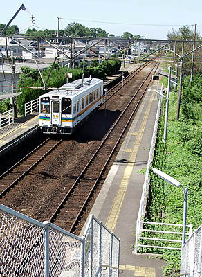 帰りの高尾野駅に停車する肥薩オレンジ鉄道電車。向こう隣りに野田郷駅がある。その一帯を祖母マツカメさんや