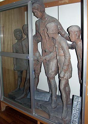 先の「安養寺町」から徒歩5分ほどの所にある城東小学校。この校舎内に、「平和の誓」像がガラス・ケースに