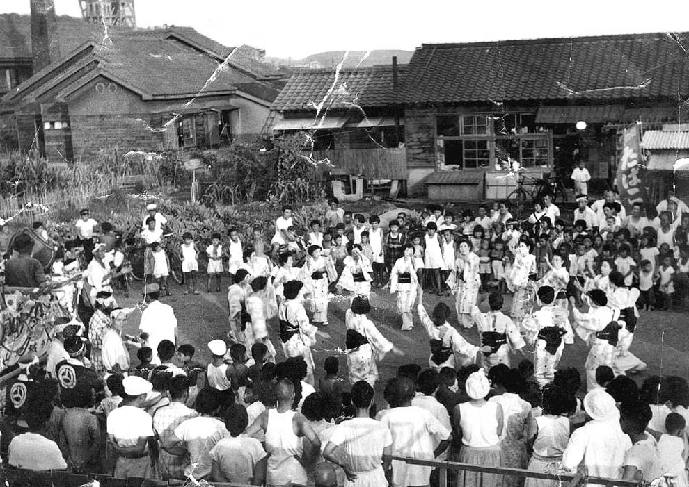 三井石炭鉱山四山社宅共同浴場前広場。左側後方に四山竪坑が見える。