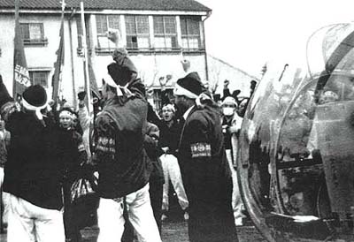 これに対し210名は応じたが残りは勧告を拒否。12月8日、同会社前において退職勧告状返上デモが繰り広がれた。 しかし、12月11日、会社側は、退職に応じない者は指名解雇すると通知。1277名に対し12月15日付けの指名解雇 通知が郵送された。 これに対し三池労組は、翌35年1月5日、指名解雇状返上総決起集会を開き、固く門を閉ざして話し合いに応じよ うとしない会社側に対して三池労組は指名解雇通知書をこのヘリコプターで会社へばらまき返上した。