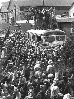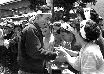 した。写真は、昭和35年4月29日、その出頭寸前、1千数百名の組合員から激励を受けているところである。
