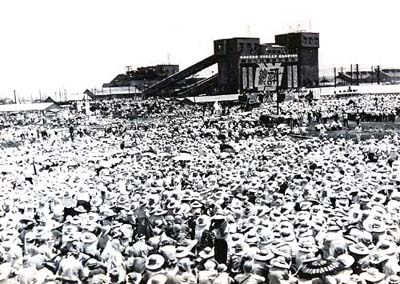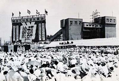 昭和35年7月17日、総評九州拠点共闘会議は午後0時40分から三川鉱ホッパー前の広場 に10万人の組合員やオルグを動員して、「安保体制粉砕、不当弾圧反対、三井闘争を守る大集会」を開いた。江田 社会党書記長、宮本共産党書記長、主婦会、全労連、部落解放同盟など代表が集まった。(朝日新聞より)