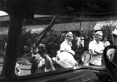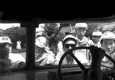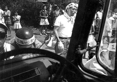 昭和35年8月、大牟田市の三井鉱山通松社宅にあった三池労組通松地域分会に 右翼団体が車で乗り込んできた。「大牟田の将来を案ずる我々市民団体に対し、右翼と罵った組合員がいる。 そいつを出せ。」と言ってきたという。そのときの写真3枚。抗議する車の左側から撮られている。
