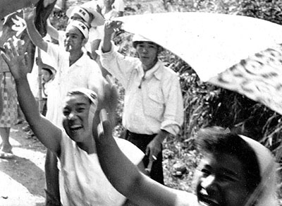 ![]() 任務を終えバスで引揚げるオルグたちを見送る三池の人々 |