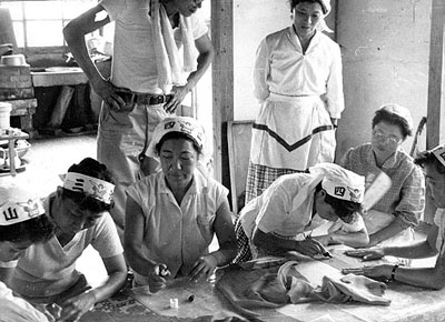 ![]() 赤旗に寄せ書きをする三池主婦会の人たち。中央が前川さん。その左、西島さん。右側眼鏡の人が山下さん。
