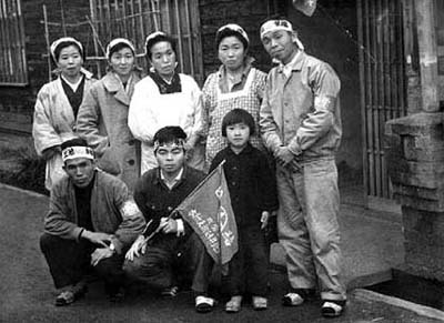(写真提供:織田さん) 「三池闘争へ応援動員で来られた山口県の宇部炭鉱労組の方たちでは?という記憶です。 場所は本所支部臼井地域分会の社宅前。白の割烹着を着ているのが私の母。社宅の空家をオルグさんたちの宿舎にして いました。ピケ隊の非番の時、炊き出しの合間に撮ったものと思います。」(話:織田さん)