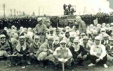 解除指令の日まで実に1年近くにわたって繰り広げられた総資本対総労働の闘いであった。 その闘いは、昭和28年8月から同年12月までの「英雄なき113日の闘い」と呼ばれ組合側が勝利した争議のときから、会社側としての 来る闘いへの備えはすでに始まっていた、とも言われている。 よって、三池大争議の発端となった第2次合理化案の特徴は、「勤務状態不良の者」「集団生活不適当な者」を理由とした職場活動家 の排除であり、単なる人減らしではなかった点にある。 それは、おとなしい父ちゃんであっても、その母ちゃんが三池主婦会でバリバリだったりすると、その影響をモロに受けて首になる 父ちゃんたちもいたほどである。 ![]() (昭和35年、三川鉱にて)