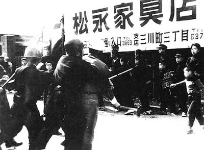 写真は、暴れまわるオノを持った「灯をともす会」の男。近くにいた社宅の子供らも引きつった顔をして逃げ回った。同 所付近において三池労組員の久保清さんが暴力団に刺殺されるほんの数時間前のことである。