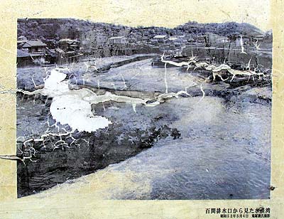 (写真下は説明板から接写した「百間排水口から見た水俣湾」。写真上は、その現在の様子)
