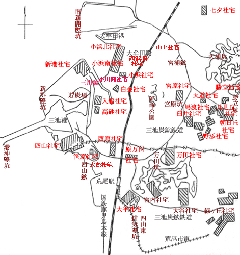 下町、土手町)、万田社宅東(宮坂町、仲町、山上町、万町、通町、辻町)、大平社宅、原万田社宅があり、四山鉱付近に大島