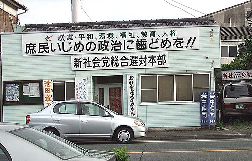 荒尾市電廃線跡沿いに建つ新社会党荒尾総支部。荒尾市議会議員定数26名の内、新社会党議員4名、