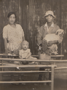 写真左に写るのは両親と長兄。その写真裏には「昭和16年5月13日寫 政則二才、主人三十一才、私二十四才」とある。両親らは日本敗戦時まで「台南州虎尾郡虎尾街尾園」(現・雲林縣虎尾鎮埒内里尾園路)で暮らし、長兄と姉は同所で生まれた「湾生」。
