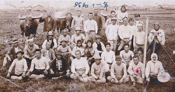 写真左の裏には「昭和十一年 共同作業中」と書かれ、全員の名が記されてある。